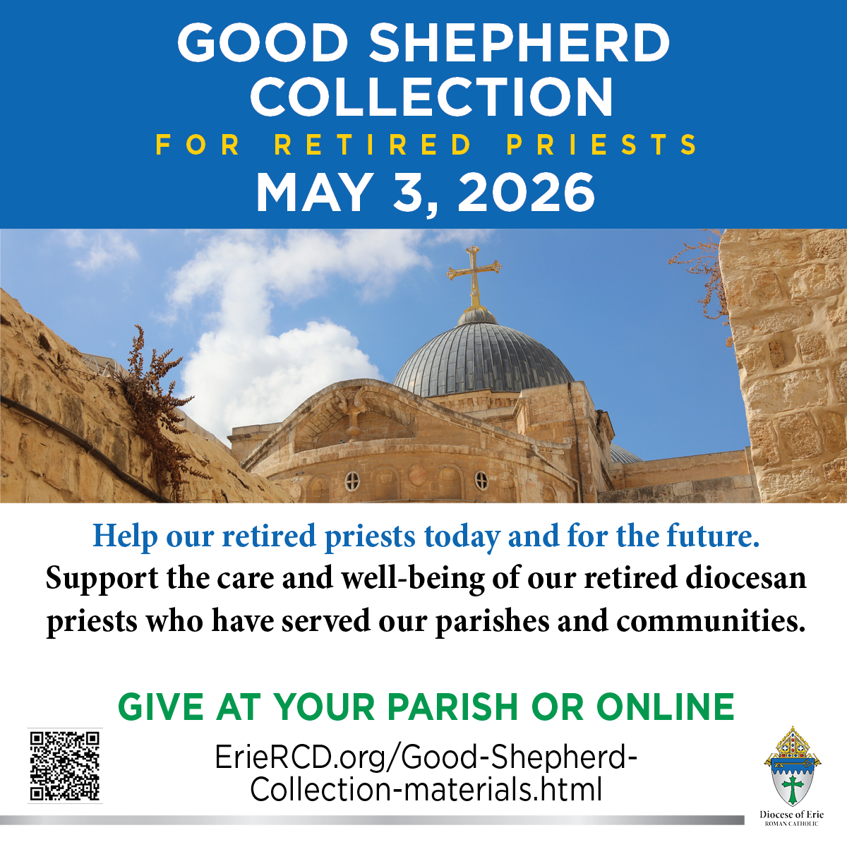 The annual Good Shepherd Collection in the Diocese of Erie supports the care and well-being of our retired diocesan priests. This collection is taken up on Good Shepherd Sunday and is a direct way for the faithful to express gratitude for the priests who have served our parishes and communities.For generations, our priests have faithfully administered the sacraments, guided the faithful and walked with families through every stage of life. This collection ensures they are cared for in retirement with dignity and compassion.