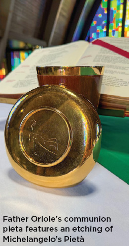 The chalice was crafted just before his ordination in 1970, a gift from his parents. Wanting something personal, Father Oriole asked family friends in Russell if he might use wood from Yule Tree Farm, their family farm. The wood was sent to a chalice company in Montreal, Canada, which fashioned it into a simple but striking cup. The design reflects two important parts of his life: the engraved image of Christ the King, a tribute to the seminary in New York where he studied, and the carefully crafted wood that ties him to his roots. Even the communion plate holds a subtle symbol— an etching of Michelangelo’s Pietà on the underside. The original statue and Pope Paul VI both visited the United States in 1970 as part of the World’s Fair in New York.