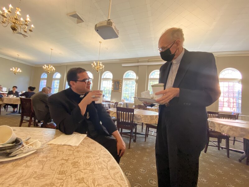 Salvadoran Bishop Oswaldo Escobar, left, talks with