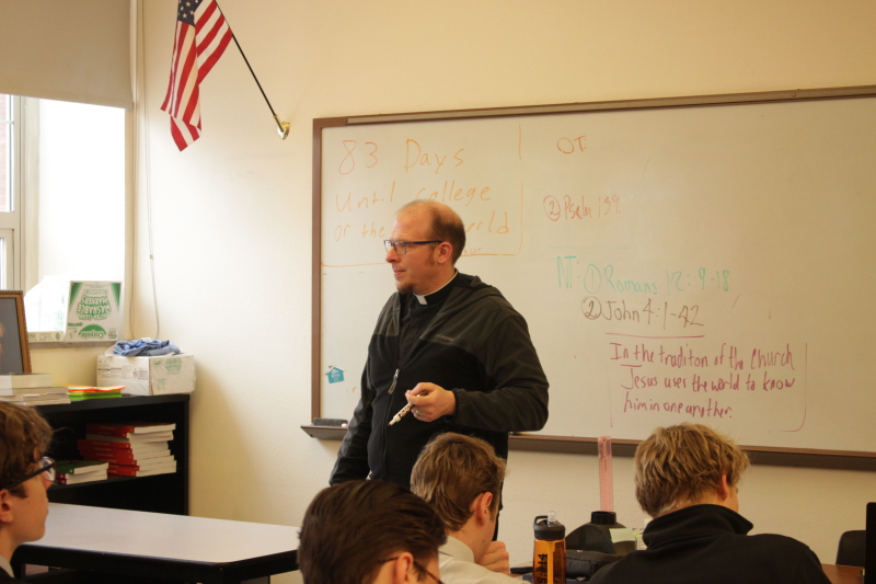 “You must make some connection with them first. Just showing up is crucial to establishing such connections. They definitely notice when you are present at lunch every day or on the sidelines of every basketball or football game, not just the all-school Mass; these students are more likely to say ‘hello’ — even if they never have before, especially upperclassmen — because they have seen me around. That allows me to get to know them better,” said Father McElrath.