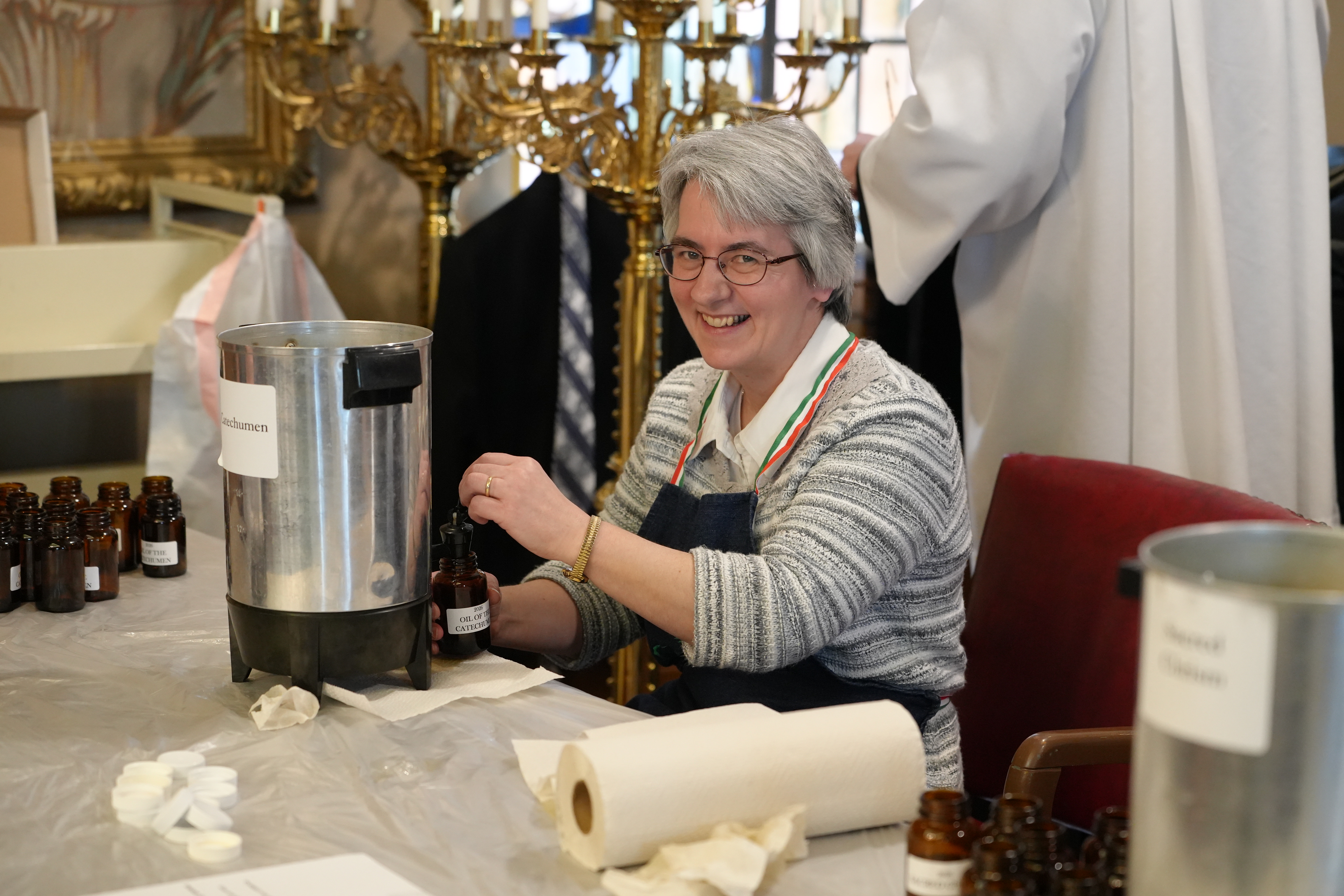 In the days leading up to the celebration, Maripat Grant of the Diocese of Erie’s Office for Divine Worship carefully coordinates and organizes every detail from her office, ensuring the sacred oils are prepared for distribution to parishes across the diocese.