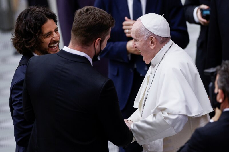 Jenkins said he told the pope, "I'm a Protestant, but I'm making a show about Jesus that people of all faiths appreciate." The pope pointed to the bearded, wavy-haired Roumie next to him, asking astutely, "Is he Jesus?"