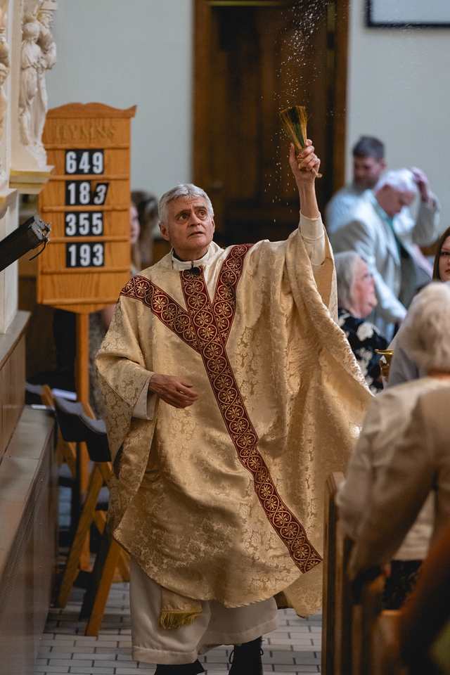 Across town at Saint Peter Cathedral, Bishop Lawrence T. Persico served as principal celebrant of the Vigil. The liturgy began outside in darkness, where the new fire was blessed and the Paschal Candle—Christ our Light—was lit and carried into the cathedral. One by one, the light spread throughout the assembly, illuminating the space and serving as a powerful sign that the light of Christ is never diminished, but shared.
