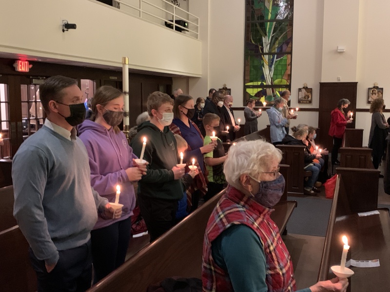 Participants were then invited to light their own candles from those illuminated before each of the three persons featured, representing mercy, courage and advocacy, respectively.