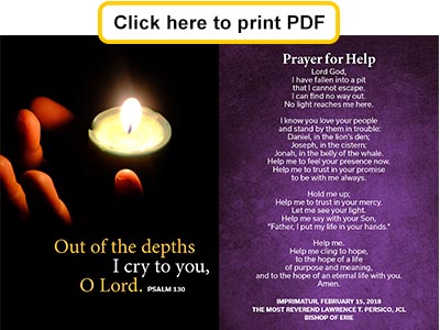 Prayer booklet for friends and families of those suffering from addiction available from the Diocese of ErieThanks to a grant from the Evangelization Endowment of the Catholic Foundation of Northwest Pennsylvania, the Diocese of Erie has printed special prayer booklets designed for those who are involved with a person suffering from addiction. The booklets, available at all parishes, are accompanied by a letter from Bishop Persico and a holy card with the Divine Mercy image and chaplet. They may also be requested through the Communications Office by calling 814.824.1161.